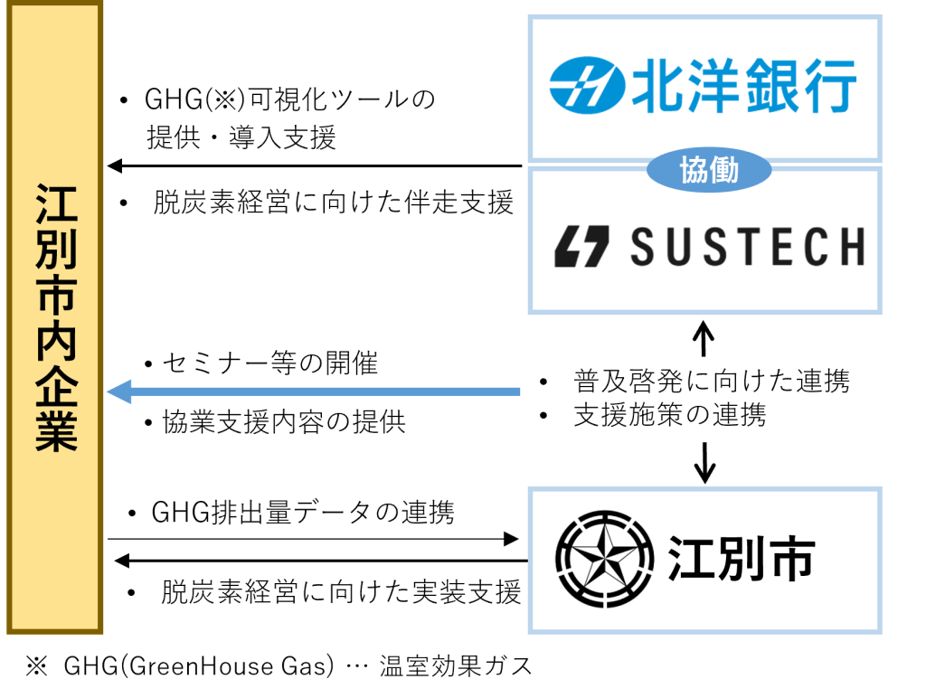 本協定書に基づき、サステナビリティ方針に基づき、すべてのステークホルダーの皆さまと地域社会と環境の持続的発展の貢献に取り組む北洋銀行のネットワークとSustechの脱炭素化支援のノウハウを活用した協業により、2050年までに二酸化炭素排出量の実質ゼロを目指す、「ゼロカーボンシティ江別市」の市域企業の温室効果ガス排出量の可視化を契機とした江別市域内企業の脱炭素化に貢献してまいります。